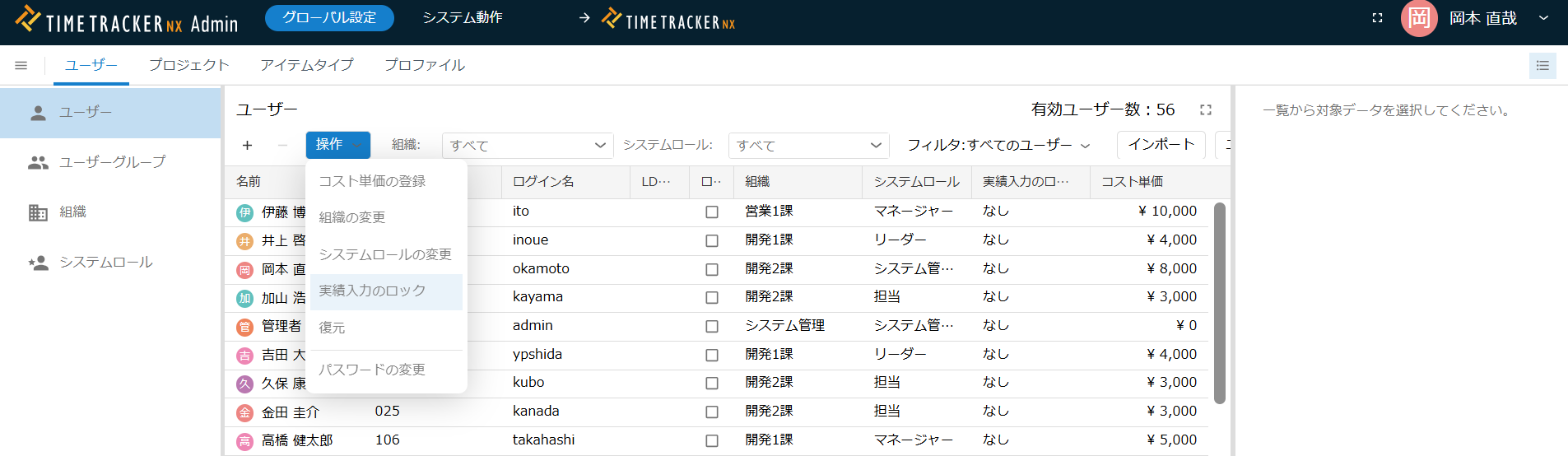 TimeTracker NXでは、ユーザー単位で実績入力をロックする設定が可能です。